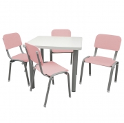 A Mesa didática infantil e suas 4 cadeiras coloridas Lg Flex formam um conjunto alegre, ideal para áreas de recreação e atividades pedagógicas.